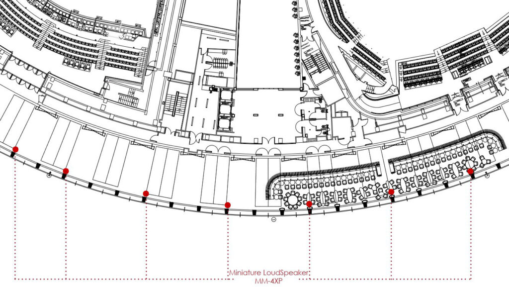 Le nombre, la position et la typologie des enceintes ont été optimisés dans le but de performance acoustique et de discrétion maximale.  Néanmoins, le positionnement de chaque enceinte est nécessairement accompagné d’un raccordement au local NRA en priorité ou NRU le plus proche en câblage réseau et alimentation électrique ou câble HP.