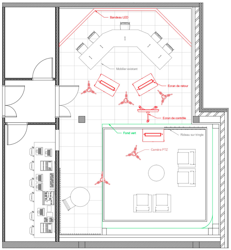 – Une zone «enregistrement vidéo» qui disposera d’un aménagement modulable avec un fond vert et/ou fond déco et/ou tenture noir ou blanche